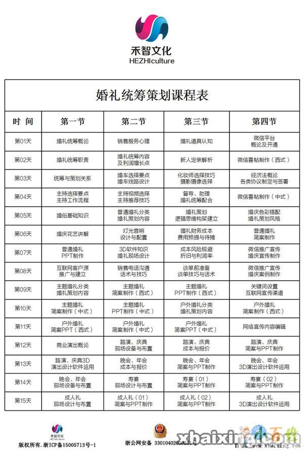 课程内容:婚礼统筹师培训、婚礼策划培训、商业演出策划培训、3D婚礼演出软件的设计与运用,经济发相关知识、财务成本核算、微信平台制作推广、大型搜索引擎客户渠道建立等课程。